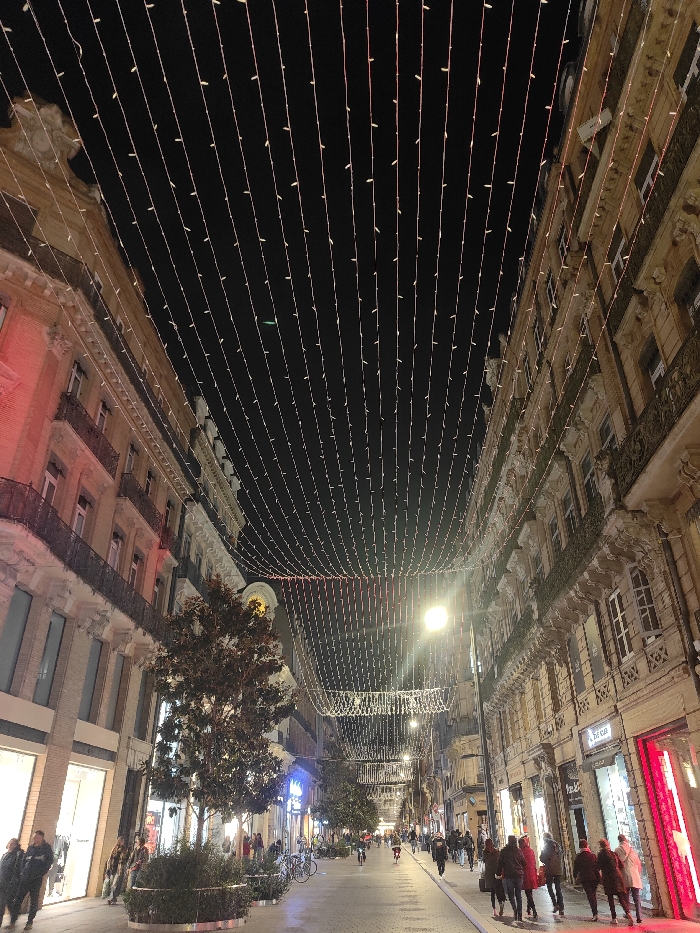 A long city street at night, framed by tall buildings on either side. Strings of lights are strung overhead, creating a canopy effect above the street. People are walking along the sidewalks, some gathered in groups. Storefronts line the buildings with illuminated windows. Streetlights are visible in the distance, adding to the overall illumination. The sky above the lights is dark, emphasizing the glow of the street.