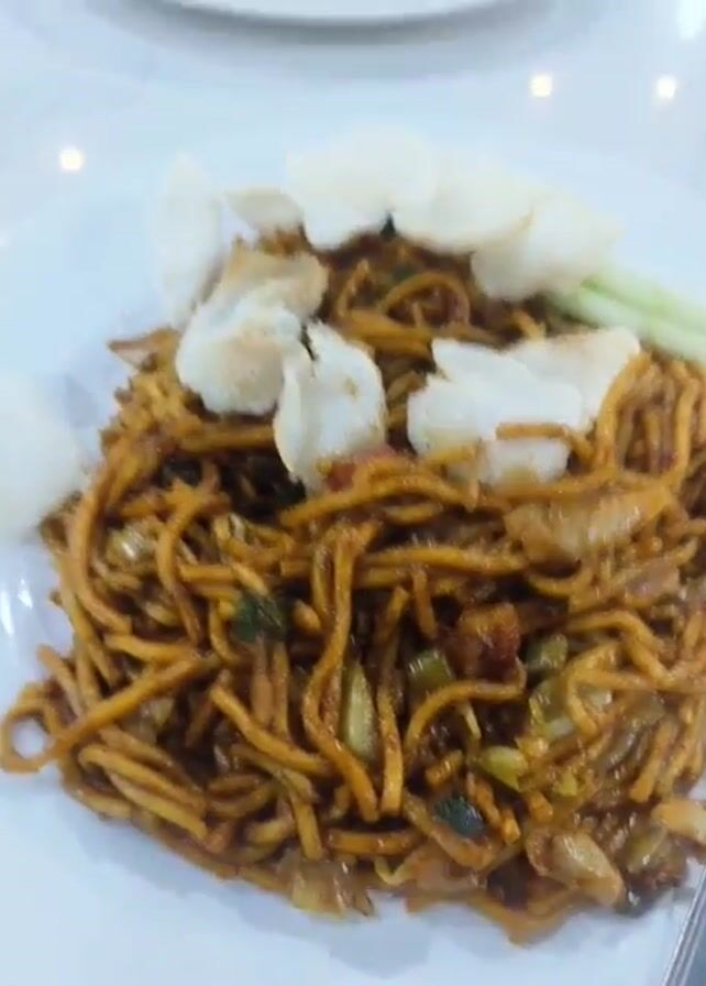 Two plates of food are visible on a white marble table. The plates contain dark brown noodles with bits of vegetables, topped with white chips and slices of cucumber. Each plate has a spoon and fork set next to it. The background is slightly blurred, showing a red chair and possibly other people. The lighting is bright and even, highlighting the texture of the food and the table surface.
