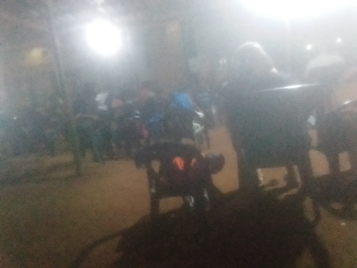 This low-resolution, heavily blurred image depicts a dimly lit outdoor or semi-outdoor scene at night in the city of Unknown, Unknown. A single, intense artificial light source in the upper-center creates significant overexposure and lens flare, obscuring details. The ground appears to be uneven, unpaved earth. A dense crowd of indistinct figures is visible in the midground and background, their features and attire rendered unrecognizable due to the low light and blur. In the immediate foreground, dark, shadowy forms consistent with simple furniture are present. To the left foreground, a dark, low object exhibits a faint reddish-orange glow, possibly indicating embers or a small heat source. To the right foreground, a large, dark, upright silhouette, consistent with a standing or seated individual, partially obstructs the view. No specific actions or interactions are clearly discernible among the individuals present.
