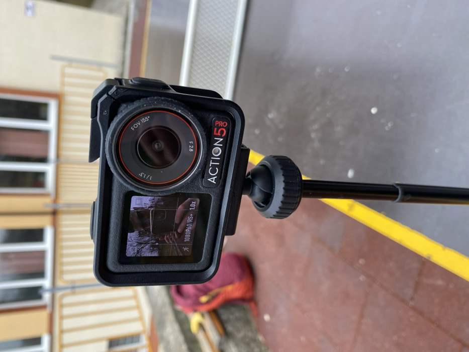 - "A black DJI Action 5 Pro camera, mounted on a black monopod, is the central subject, positioned outdoors in Shumen, Bulgaria" by FM-v4VIh1, licensed under CC BY 4.0