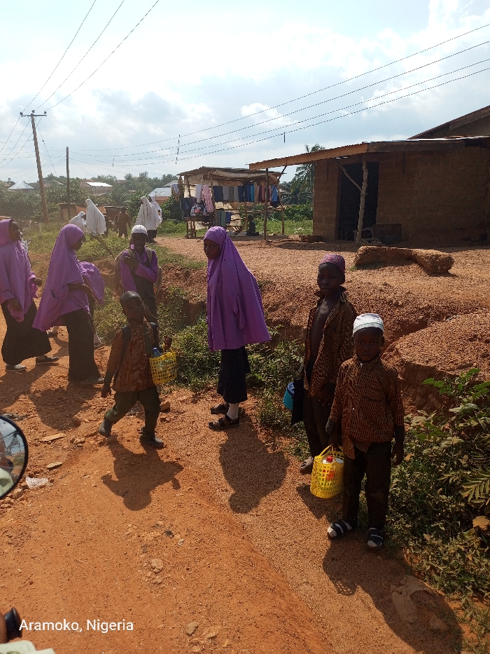 group of people, mostly children, in a rural street in Ilobu, Nigeria. The street is unpaved and dusty. The children are carrying baskets, suggesting they might be returning from a market or school. The background shows a modest house with a thatched roof, a utility pole with power lines, and a few trees. The scene seems to be in a rural part of the town, with a lot of dust and dirt. There are six children visible in the scene: three girls and three boys. The girls are wearing hijab, and the boys are wearing caps. Some of the children are carrying baskets in their hands, which are likely filled with groceries or other items. One child is standing on the side of the street looking at the camera. The children are dressed in simple clothing, and the overall scene suggests a rural and modest setting.