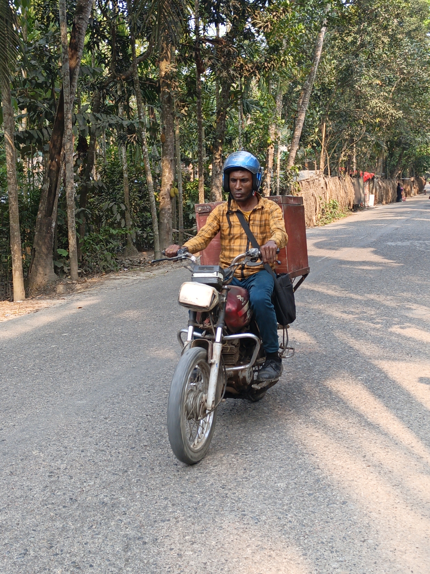 An adult male is observed operating a maroon and white motorcycle on a paved road in Mehendiganj, Bangladesh. He wears a blue open-face helmet, a yellow plaid long-sleeved shirt, dark blue pants, and dark shoes. A black strap is visible across his chest, and a black bag is suspended from the left side of the motorcycle near his leg. A large, reddish-brown rectangular delivery box is securely mounted to the rear of the motorcycle. The motorcycle's front wheel exhibits slight motion blur, indicating movement. The asphalt road surface is textured and shows patches of sunlight interspersed with distinct shadows, suggesting a low sun angle. Both sides of the road are bordered by dense green foliage, consisting of numerous tall trees and undergrowth. Along the right side of the road, a rustic fence-like structure constructed from woven natural materials is visible, behind which a distant figure in dark clothing can be seen further down the road.
