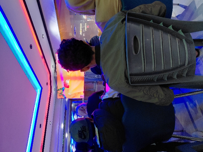 People are gathered indoors. A man with dark curly hair looks toward a screen displaying colorful images. A person with a Nike Air hat is present. The interior is brightly lit with neon lights along the ceiling. One person is sitting on a chair with a gray patterned back, and wearing a khaki jacket. Other people are sitting and standing near them.