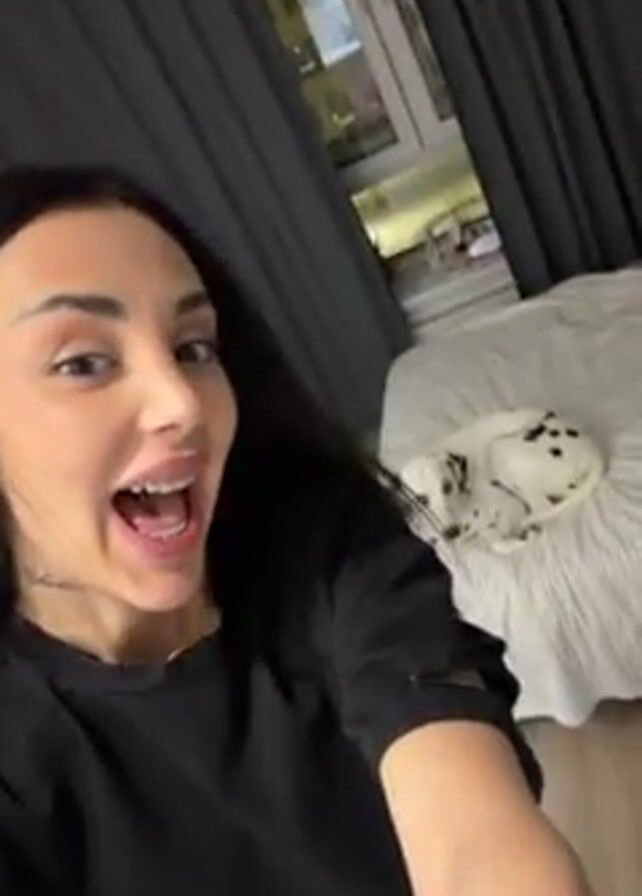 A woman with long dark hair and a black top is holding a phone, facing the camera and speaking. She moves the camera to show a Dalmatian dog lying on a bed behind her. The dog is white with black spots. The woman says "My little dotto, I love you." The bed has a white cover with a patterned texture. The background includes a window with gray curtains and buildings visible outside. The video is shot indoors with artificial lighting.