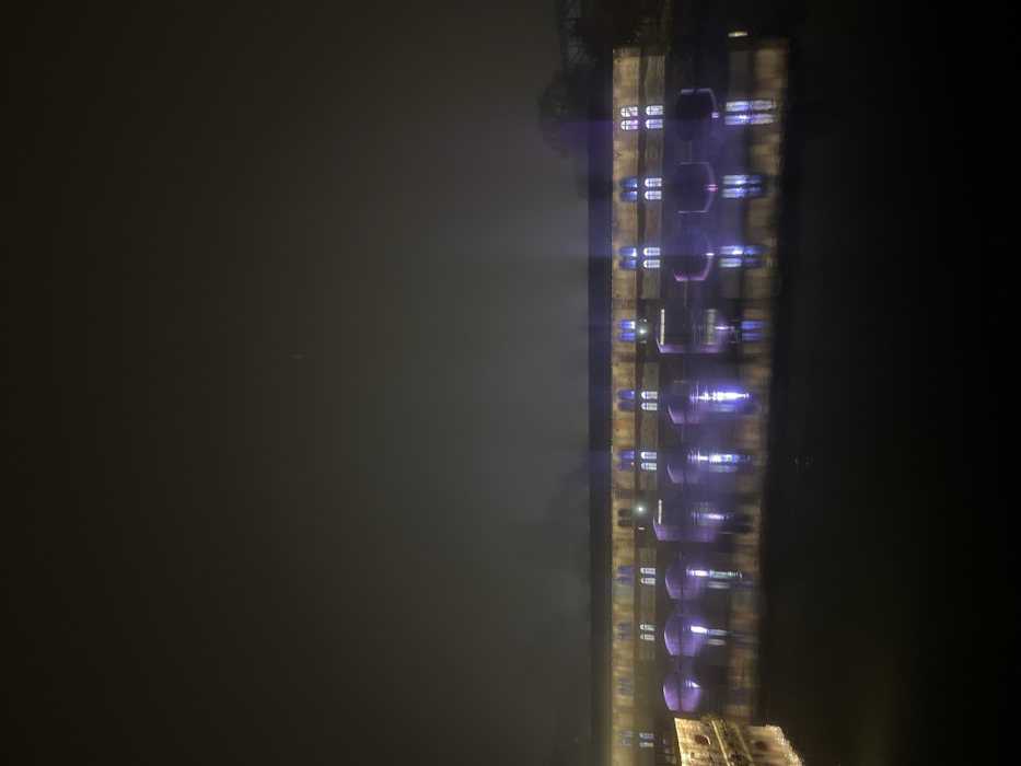 The image depicts the Ponts Couverts (Covered Bridges) in Strasbourg, France, at night, viewed across the Ill River. The scene is dominated by a long, multi-arched stone structure that spans the river. The upper section of the structure presents a continuous building facade with numerous arched windows. Some windows are illuminated with warm white light, while others display a distinct violet or purple light. Below this building, multiple stone arches support the structure, with violet lights positioned near the water level projecting upwards, illuminating the undersides of the arches. These lights create prominent reflections in the calm, dark river water, mirroring the violet and white light patterns. The sky above is dark and appears hazy or foggy, with visible light beams extending upwards from sources on or near the structure. No individuals are present. Distant trees or obscured structures are faintly visible on the right horizon, partially veiled by the atmospheric conditions.