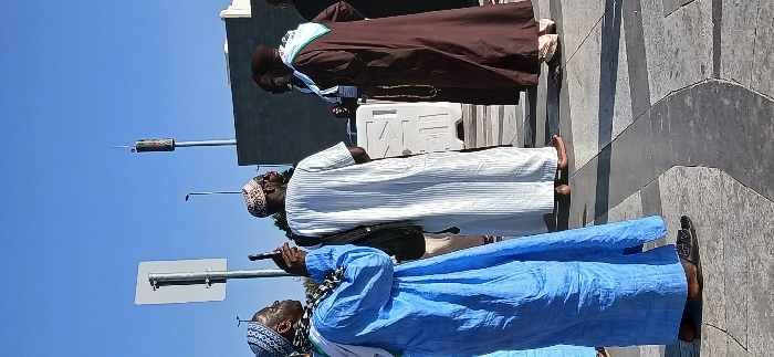 The image displays an outdoor daytime scene in Medina, Saudi Arabia, featuring three men on a patterned paved area under a clear blue sky
