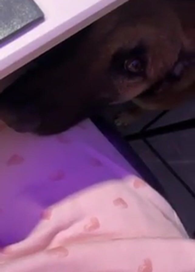 A person wearing light pink pajamas with a heart print is seated. A brown dog is beside them, partially hidden under a white table. The dog glances up at the person and appears to lick its nose. A black chair is visible next to the table. The lighting is dim, with a purplish hue.