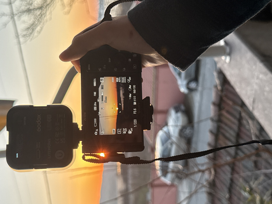 A first-person perspective captures a person holding a black Sony ZV-E10 mirrorless camera, equipped with a Godox LITEMONS LED 60 hot shoe light, aiming it towards a sunset
