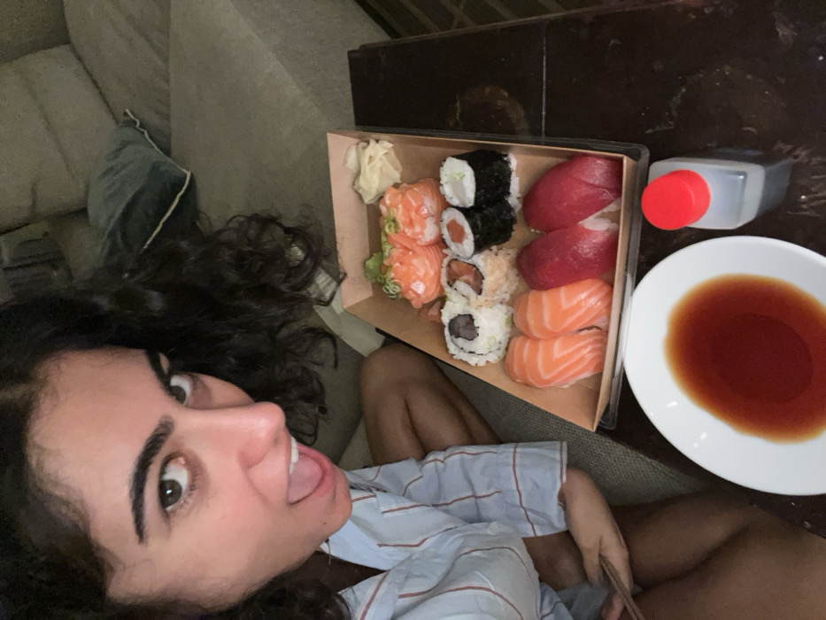 An indoor scene captured in a residence in Aldoar, Foz do Douro e Nevogilde, Portugal, depicts a young female seated on a sofa, looking directly at the camera with an open mouth and wide eyes. She has dark, curly hair and is wearing a light blue and white striped top. Her left hand, partially visible, holds chopsticks. In the immediate foreground, on a dark, reflective table surface, a rectangular cardboard container holds an assortment of sushi. The sushi selection includes salmon nigiri, tuna nigiri, various maki rolls, salmon tartare, wasabi, and pickled ginger. Adjacent to the sushi container, a white oval dish contains a dark liquid (soy sauce), and a small, clear plastic dispenser with a red cap is positioned nearby. The background is softly illuminated, showing a grey fabric sofa with a dark-colored throw pillow. The overall lighting is dim, suggesting an evening or nighttime setting.