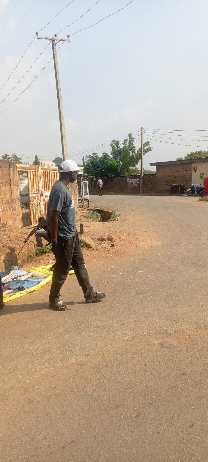This image captures an outdoor street scene during daytime in Unguwar Rimi, Nigeria. The foreground consists of an asphalt road displaying minor wear and patches, with an adjacent dirt area on the left. In the mid-ground, an adult male walks from left to right, his gaze directed towards the right. He wears a white baseball cap, a dark grey t-shirt, dark trousers, and dark sandals, with his hands in his pockets. To his left and slightly behind him, another male individual is crouched on the dirt ground next to a yellow tarp spread with various clothing items; he appears to be holding a stick or similar object. An open concrete drainage gutter runs along the edge of the dirt area. The background features various structures and elements. On the far left, a low concrete wall is visible with partially legible white text, including "FOR SALE" and "KADUNA STATE," alongside a rusty, partially open metal gate. A tall concrete utility pole with three visible power lines extends diagonally upwards from the left. In the background on the right, a low, block-built structure, possibly a small shop, features a faded red and white logo on its wall and has a dark scooter parked adjacent to it. Another utility pole is visible further back on the right, with additional power lines spanning across the frame. Green trees and dense foliage are present behind the structures and walls. In the distant background on the road, a third male individual walks away from the viewer, clad in a light-colored long-sleeved shirt and dark pants. The sky is a pale blue with minimal cloud cover.