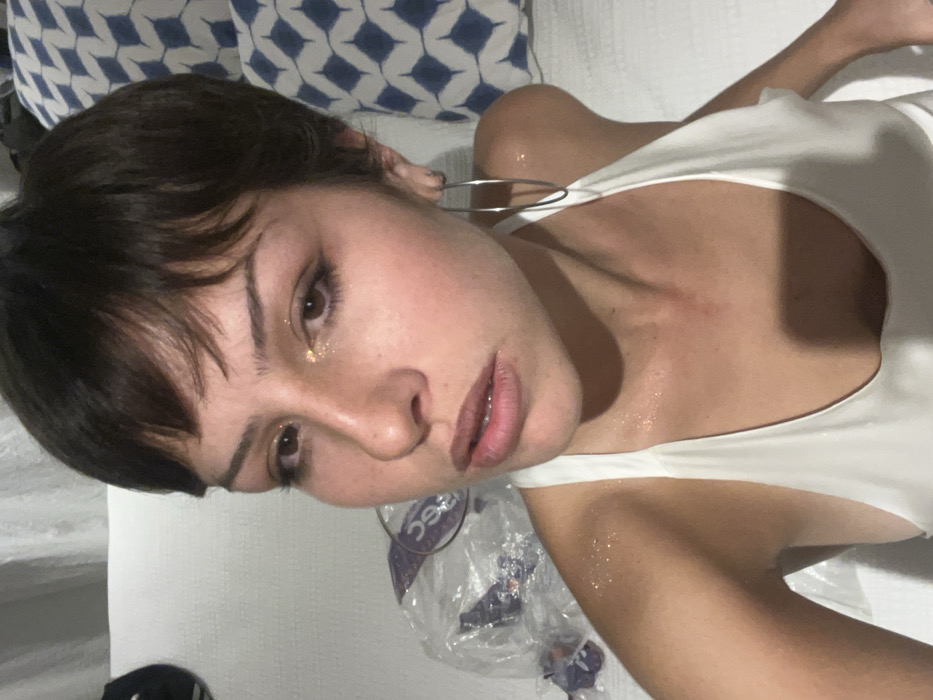 A woman with short dark hair lies on a white bed. She wears a white tank top. Gold glitter adorns her face near her left eye and her right shoulder and chest. Large silver hoop earrings are visible. A pillow with a blue and white pattern is in the background. A plastic bag with writing on it is near her body.