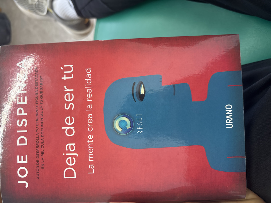The scene depicts a human left hand holding a paperback book. The book cover is predominantly red, featuring the title "JOE DISPENZA" in white at the top, followed by "AUTOR DE DESARROLLA TU CEREBRO Y FIGURA DESTACADA EN LA PELÍCULA DOCUMENTAL ¿Y TÚ QUÉ SABES?" in smaller white text. The main title "Deja de ser tú" and subtitle "La mente crea la realidad" are also in white. A stylized blue human profile is prominent on the lower portion of the cover, exhibiting a single eye. Above the head, a circular icon with a white arrow indicates a 'reset' function, accompanied by the word "RESET" in white text below it. The publisher's name, "URANO", is visible in white at the bottom center of the cover. In the blurred background to the right, a person's lower leg is visible, dressed in dark trousers and a grey athletic shoe with white laces and sole details. A bright green surface, consistent with a table or desk, is present beneath the leg. The setting appears to be an interior location. The specific urban location of Las Crucitas, Mexico, is not discernible from the visual evidence.