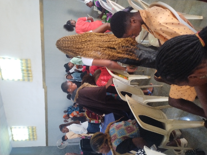 This image depicts an indoor gathering of approximately 20-30 individuals, predominantly young females, in Kabong, Nigeria