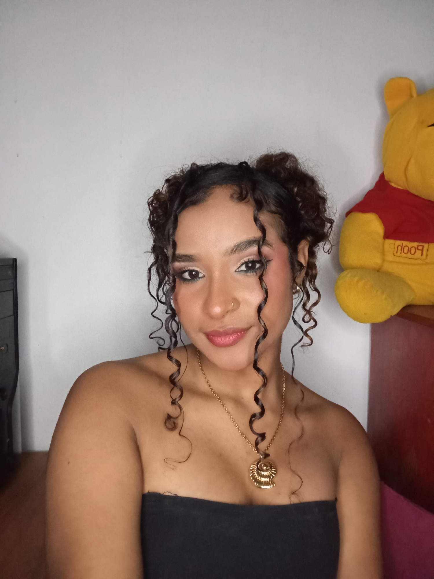 The image depicts a young woman in an indoor setting, located in Juan Griego, Venezuela. She is positioned centrally, facing directly towards the camera with a slight smile. She has medium-brown skin, dark curly hair styled with some strands framing her face, and dark eyes with visible eye makeup, including eyeliner and eyeshadow. Her lips are colored a light pink. She wears a strapless black top and a gold chain necklace with a circular, textured gold pendant. A small gold nose ring is present on her right nostril. The background features a plain light grey wall. To the left, a dark vertical object is partially visible above a wooden surface. To the right, a yellow plush toy, identifiable as Winnie the Pooh, wearing a red shirt with the text "POOH" visible (appearing reversed), rests on a dark red surface.
