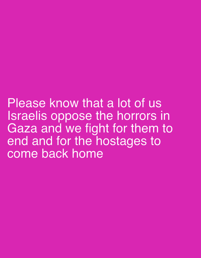 The image presents a digital graphic with a solid magenta background. White, sans-serif text is centrally positioned in the lower half of the frame. The text reads: "Please know that a lot of us Israelis oppose the horrors in Gaza and we fight for them to end and for the hostages to come back home". No physical environment, individuals, objects other than the text, actions, or interactions are visually depicted. The image does not illustrate a specific physical location within the city of Givatayim, Israel.