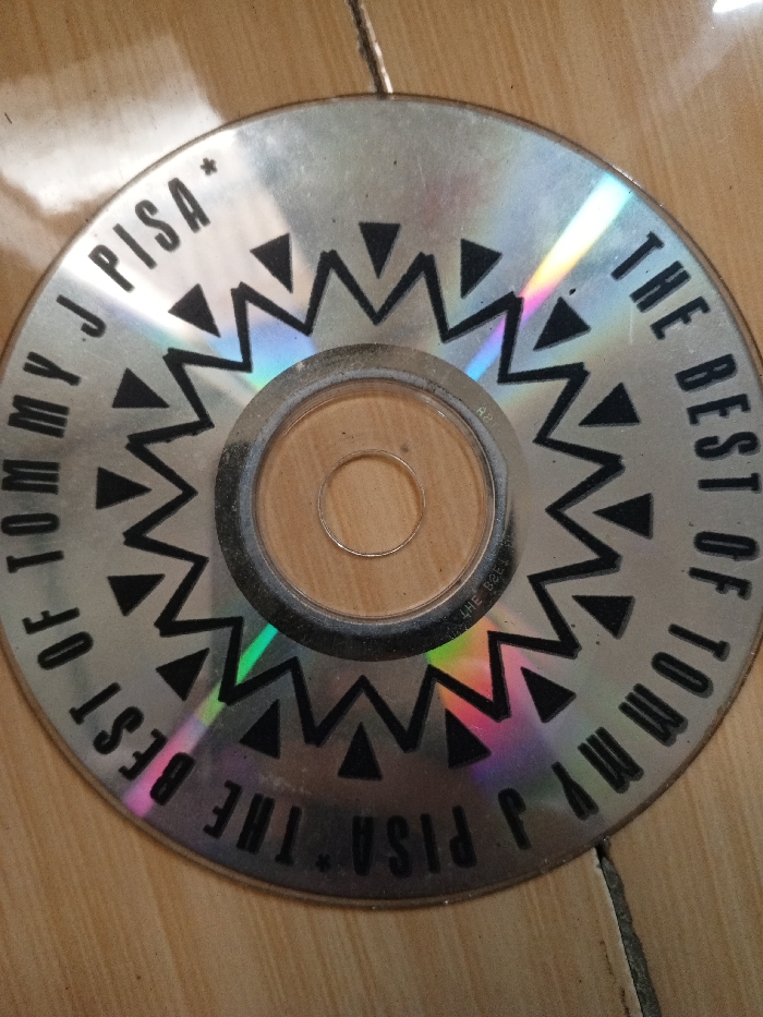 An old, circular CD sits on a light brown surface. Black text reads "THE BEST OF TOMMY J PISA" around the disc's edge, accompanied by a zig-zag pattern of black triangles. A central, transparent ring is present, revealing the surface beneath. The CD's surface shows iridescent rainbows. The CD appears worn and dusty.