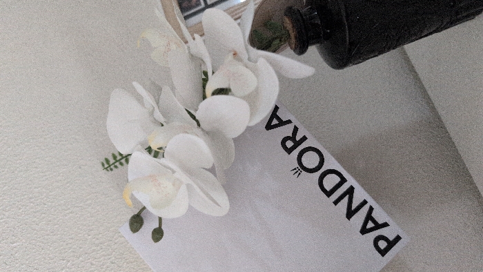 The image displays an indoor still life arrangement in Venray, Netherlands. A white Pandora gift box or bag, featuring the black "PANDORA" logo with a crown icon, is positioned diagonally on a light-colored surface, angled from the bottom left towards the center. Resting partially on this item and extending towards the upper right is a cluster of artificial white orchid flowers, interspersed with green buds and small fern-like leaves. To the bottom right, a dark, possibly black, cylindrical glass bottle with a visible cork stopper, from which a small green plant or stem protrudes, stands vertically on the same light-colored surface. The background consists of a textured, off-white wall. No individuals are present, and no actions or interactions are depicted.