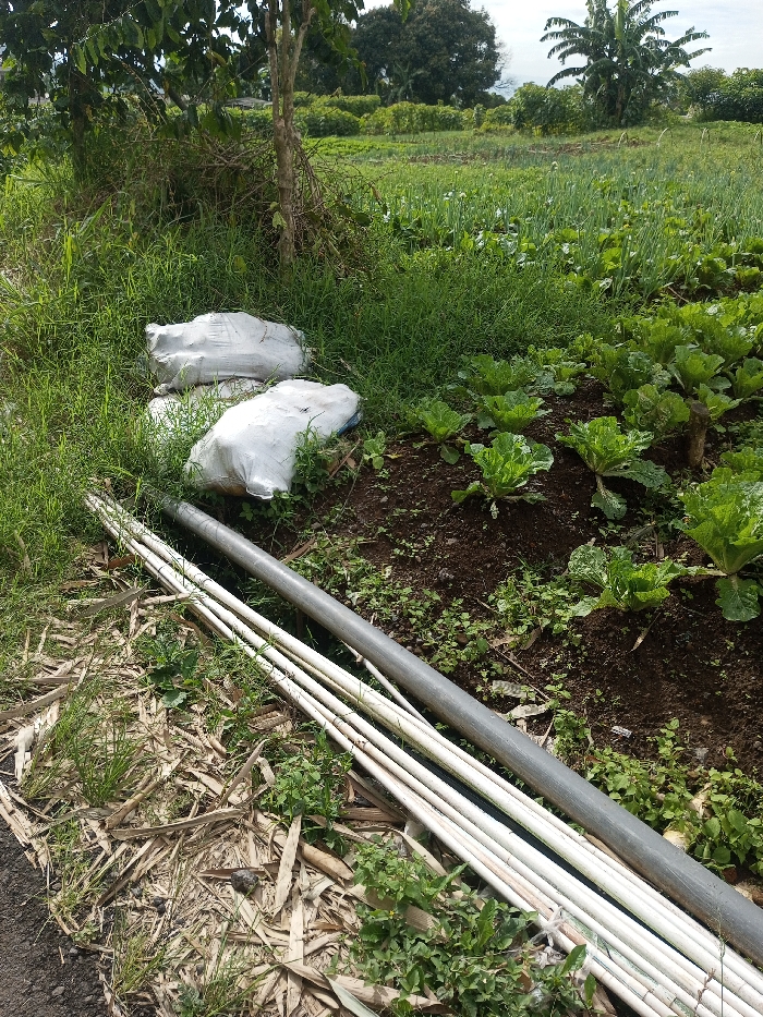 A small farm plot is visible. Vegetables, possibly cabbage, grow in dark, fertile soil. Two white sacks are nestled amongst tall grasses. A stack of white pipes and a single gray pipe lie on a bed of dried leaves and grass at the edge of the plot, next to an asphalt path. The background shows more crops extending into the distance under trees.
