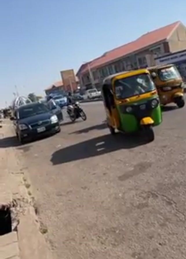street scene. In the foreground, there's a yellow and green auto-rickshaw. To the left, there are a few cars parked. In the background, we see a blue and white police pickup truck driving past. Behind the truck, there are more cars and people on the street. The buildings on the other side of the street appear to be commercial, with signs visible. The sky is clear and blue. There's a bit of shadow visible, suggesting a sunny day.