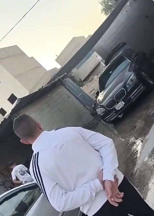 street scene with several cars parked. A black BMW appears to be parked under a damaged building. A man in a white Adidas jacket stands in the foreground, looking at the scene. Further along the street are a white sedan and a black pickup truck. Other people can be seen near the truck. The surroundings appear to be residential.