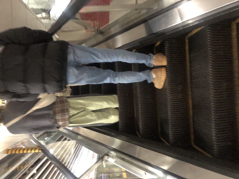 A downward-angled shot showcases two individuals on an escalator. One wears a black puffer jacket, light blue jeans, and tan shoes. The other dons a grey jacket, plaid shirt, and light green pants, with a beige shoulder bag. The escalator's steps are black with yellow accents. The surrounding environment is a bright, bustling interior space.