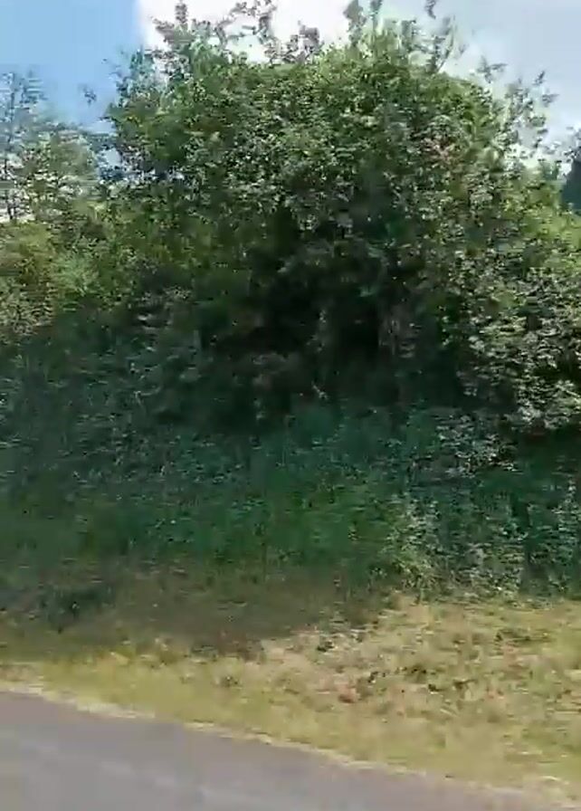 view from a moving vehicle, likely a car, driving on a paved road. The roadside features grassy areas and dense, green vegetation along a hillside. The sky is visible with a mix of blue and fluffy white clouds. The camera angle is from the vehicle's perspective, looking out towards the landscape as it passes by. There are no people visible in the scene.