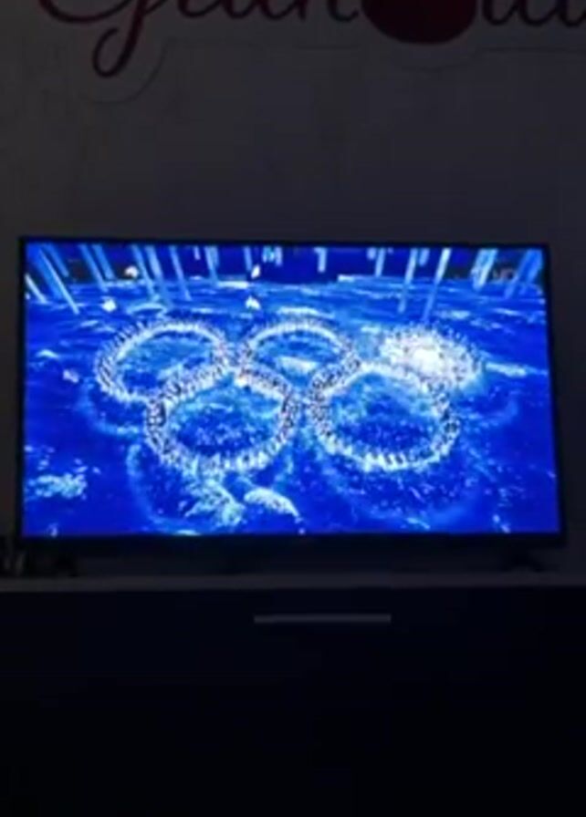 television screen displaying the Olympic rings logo
