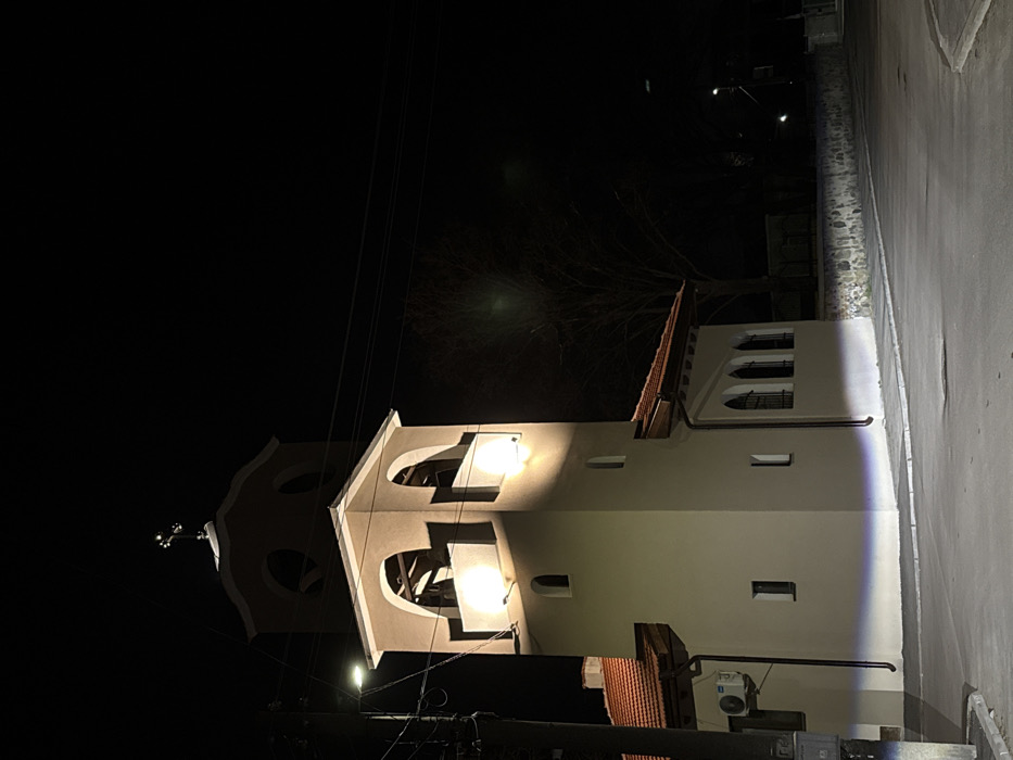This nighttime image captures a brightly illuminated church in Ihtiman, Bulgaria. The central subject is a cream-colored building with a prominent, two-tiered bell tower and a terracotta-tiled roof featuring dark eaves. The lower section of the bell tower is square, displaying two visible arched openings, each containing a bell and internally lit by bright upward-facing luminaires. Above this, a smaller, rounder tier with circular openings is topped by a reflective cross. The church structure itself features several small, arched, and rectangular windows, some equipped with dark grates. An external air conditioning unit is mounted on the building's left side. The scene is viewed from a dark asphalt road that curves slightly to the right in the foreground, separated from the church grounds by a concrete curb. A low, rough-hewn stone wall runs along the right edge of the road, extending into the background. To the far left, a utility pole with multiple overhead wires and a modern streetlight is partially visible. Beyond the church and the stone wall, against the deep black night sky, a few bare-branched trees are discernible, along with a distant streetlight. The scene is devoid of human presence or any discernible action or interaction. Illumination is entirely artificial, highlighting the church structure against the dark surroundings.