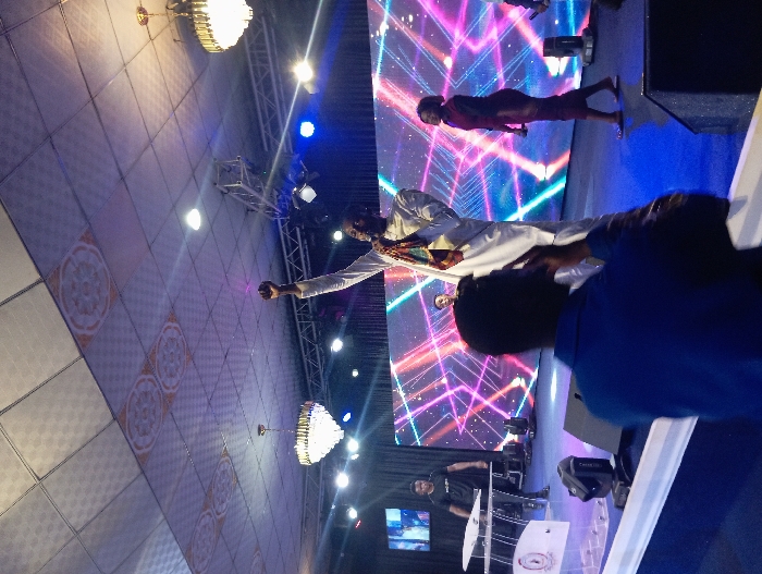A man in a white robe with a red and yellow garment around his neck stands on a stage, raising his right fist. Behind him, a large screen displays colorful, geometric patterns. Another figure stands further back on the stage. Below, a man in a blue shirt faces away from the camera. In the foreground, a podium with a logo on it stands, with additional figures faintly visible nearby. The ceiling is tiled with decorative patterns and illuminated by hanging chandeliers. Stage lighting fixtures are visible throughout.
