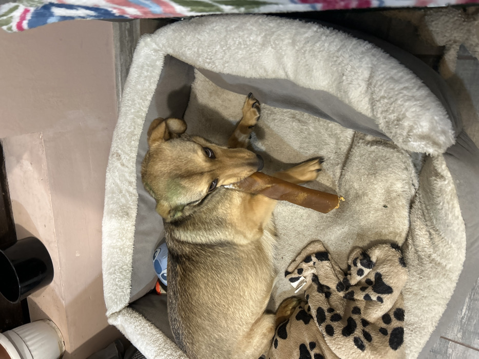 - "An indoor scene in Rogosh, Bulgaria, depicts a light brown and tan dog lying in a plush, greyish-tan pet bed" by FM-VzPM72, licensed under CC BY 4.0