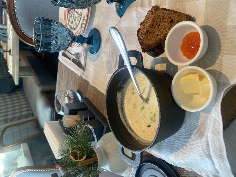 A tabletop is set for a meal featuring a cast iron pot of creamy soup with a serving spoon. Alongside are small bowls of butter and orange jam, accompanied by a slice of dark bread. A blue goblet stands on a plate, with neatly arranged silverware on a napkin. A decorative vase holding pine needles, cinnamon sticks, and dried orange is present. Seating with blue-patterned cushions is visible in the background.