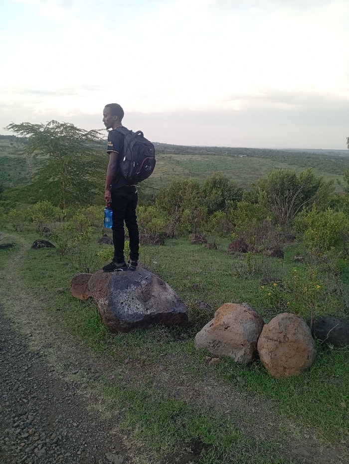 A man stands on a large rock, gazing into the distance. He wears dark clothing and a backpack, holding a blue water bottle. Rolling, green hills extend to the horizon under a cloudy sky. Several other rocks sit nearby, surrounded by short grass and scattered shrubs. A dirt path leads towards the rocks where the man stands, adding depth to the landscape.