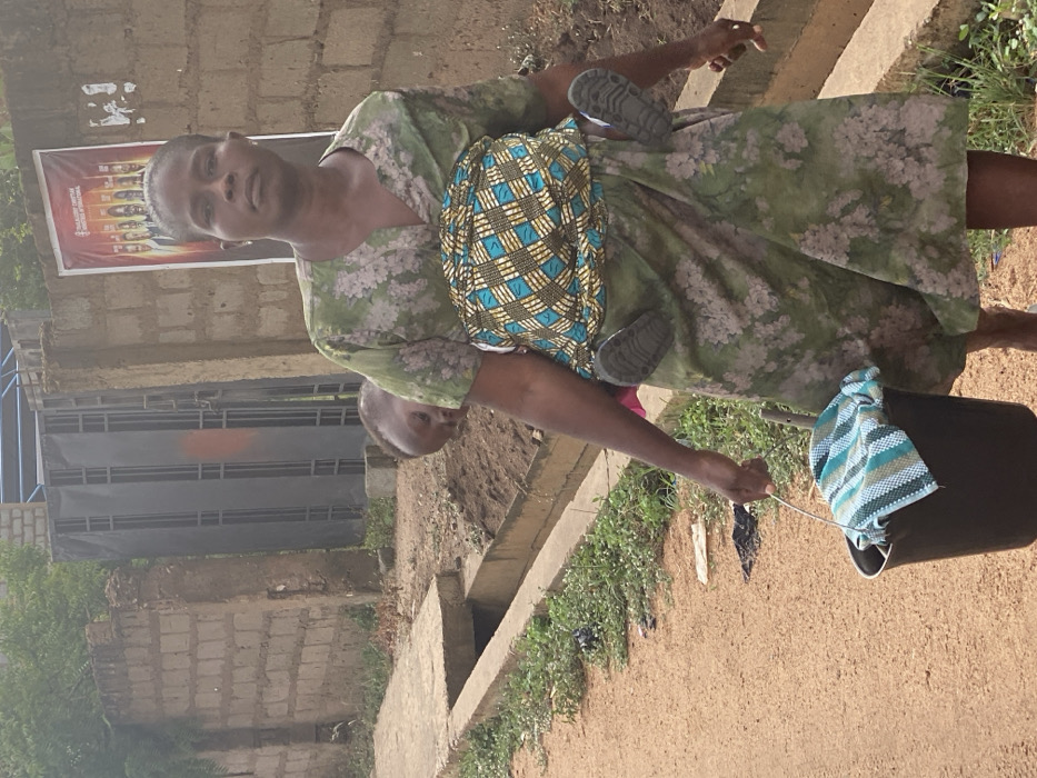 A woman in a floral dress carries a child on her back in a patterned sling with small shoes tucked in. She holds a black bucket with a striped towel. A narrow concrete ditch runs along the ground. A brick building, an iron gate, and a poster are visible in the background. The setting appears to be a residential street with vegetation and scattered debris.