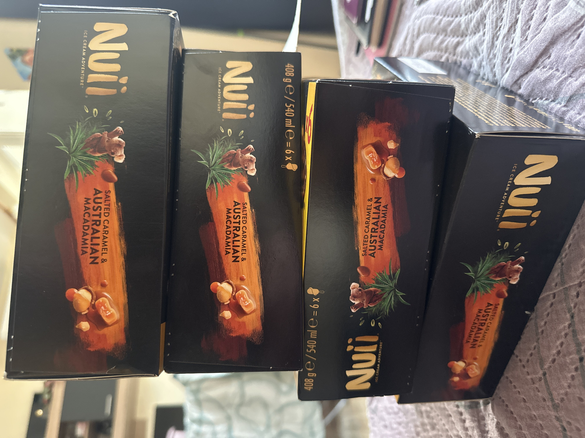 The image displays four black cardboard boxes of "Nuii" brand ice cream, stacked on a textured, light purple fabric surface. Each box features the product name "Salted Caramel & Australian Macadamia," a "Nuii" logo, and illustrations of a koala, green foliage, caramel, and macadamia nuts. The side of one box indicates "408 g / 540 ml = 6 x," signifying six ice cream bars per box. The boxes are not uniformly oriented; some display text right-side up, while others show it inverted. The background is out of focus, revealing indistinct shapes consistent with an indoor setting, including a light-colored, possibly fabric-covered object on the left and a darker, rectangular object on the right. No people are visible. The specific location within Sofia, Bulgaria, cannot be identified from the visual data.
