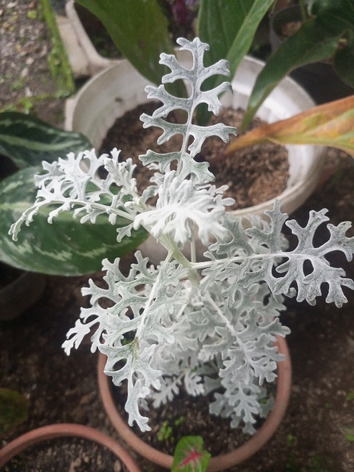 - "The image displays a close-up, top-down perspective of a Dusty Miller plant (Jacobaea maritima) in a round, unglazed terracotta pot" by FM-pw5wv2, licensed under CC BY 4.0