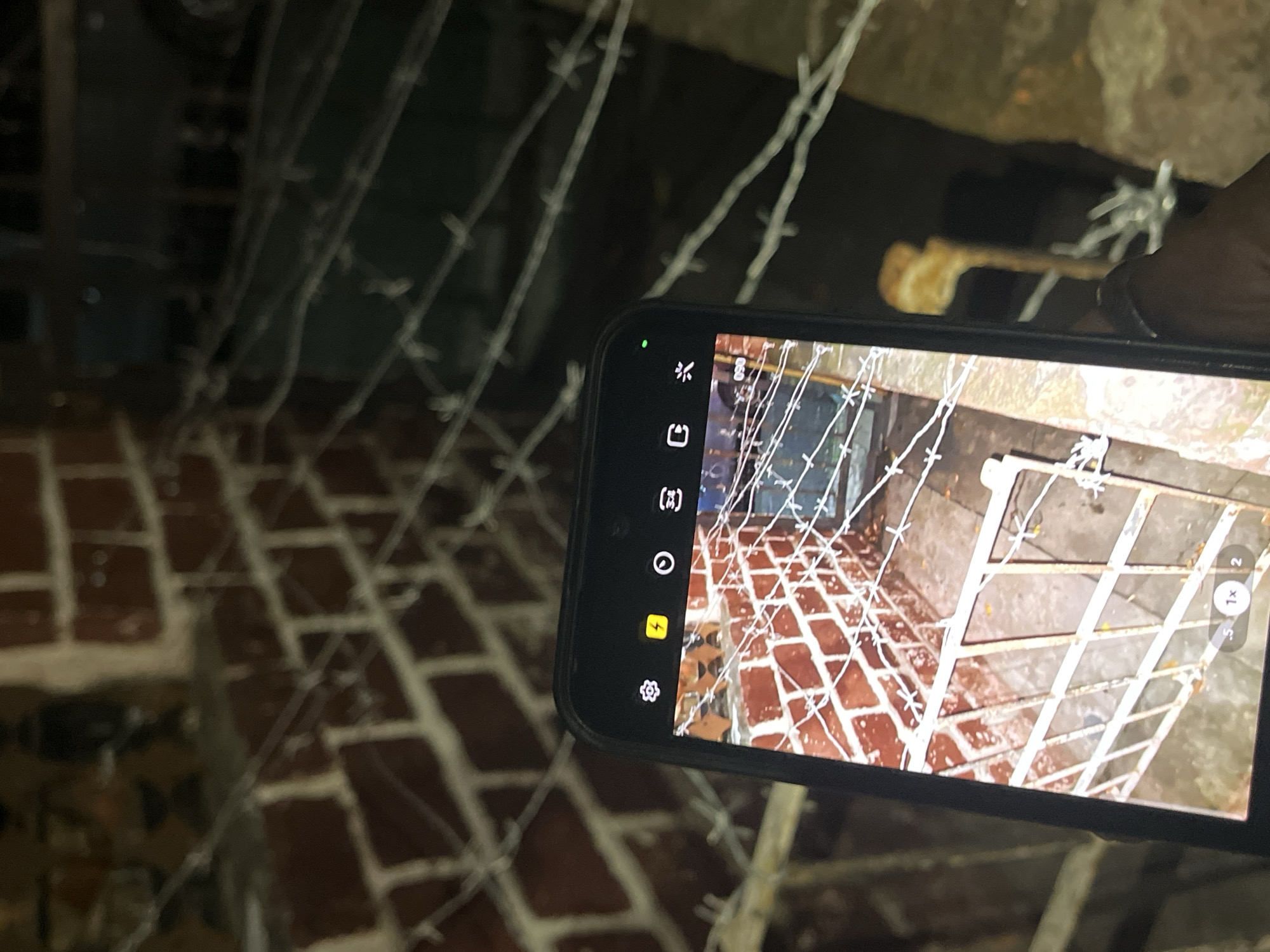 A person is using a smartphone to photograph a scene featuring a brick floor and a metal grate covered in barbed wire