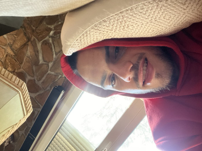 A close-up, angled photograph captures a young adult male lying on his back and looking directly at the camera. He wears a red hooded sweatshirt, with his head resting on a light-colored, textured pillow. He has dark hair, dark eyes, and facial stubble, with his lips slightly parted to reveal upper teeth in a subtle smile. The background shows an interior space with a brightly lit window to the left, featuring a partially retracted roller shutter system. To the right, a wall with a brown, multi-toned stone or faux-stone finish and white grout lines is visible, along with a partial view of a decorative object possessing an ornate frame and frilled edge. The scene is an indoor residential setting located in Unknown, Unknown.