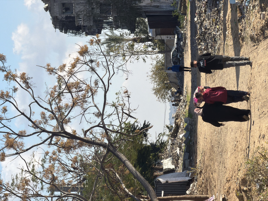 Amidst war-torn surroundings, three figures walk along a dirt path. Debris and rubble line the road, suggesting a recent conflict. A tall, damaged building looms in the background. Trees, partially obscured by the camera's perspective, add a touch of nature to the scene. The family appears to be navigating the remnants of their community.