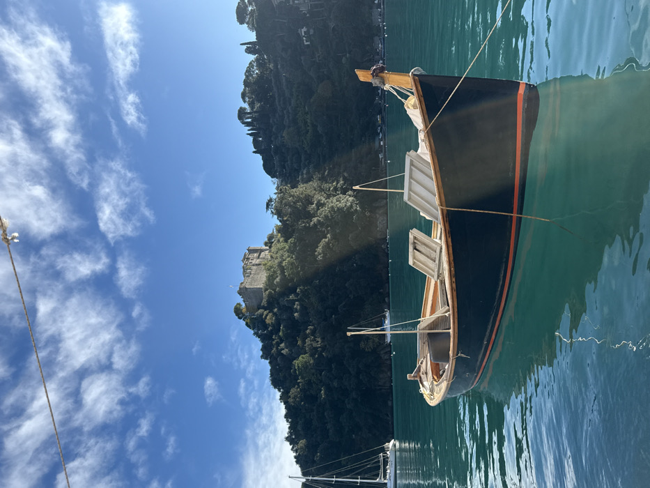 The image depicts a serene, sunny day in the bay of Portofino, Italy, facing the heavily wooded hillsides. In the foreground, a traditional wooden boat with a dark hull and a thin orange stripe above the waterline floats calmly on the turquoise water, secured by ropes extending from its bow. Two light-colored, rectangular wooden panels or covers are open and visible within the boat's interior. The boat casts a dark reflection onto the water. In the midground, to the left, a white sailboat with a prominent mast is anchored. Further back, another smaller white sailboat is discernible. The background is dominated by a steep, lush green hillside densely covered with trees. Perched atop the highest point of this hill, slightly left of center, is Castello Brown, a stone fortress-like structure with a flagpole. Sunlight streams are visible, emanating from the upper right and extending downwards across the hillside and water. The sky is clear blue with scattered, wispy white clouds. No individuals are visible in the scene, and no specific actions or interactions are depicted.