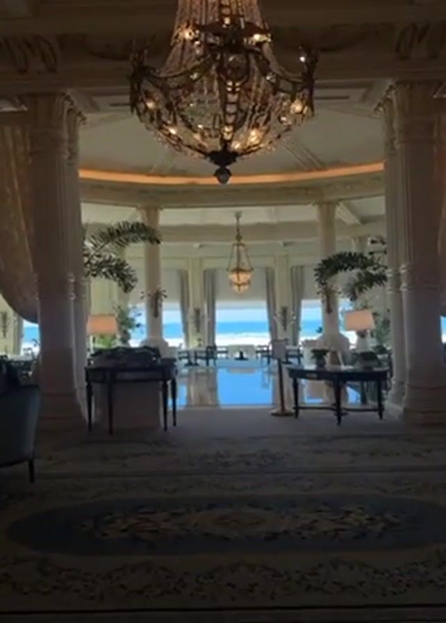 luxurious room with high ceilings, ornate columns, and large windows. The room is carpeted in a patterned blue and grey rug. Tables are positioned in the center of the room, decorated with lamps and greenery. A large chandelier hangs from the ceiling. Beyond the columns and windows is a view of the ocean. The floor appears to be polished and reflective.
