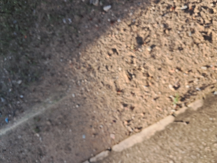 The image depicts a patch of ground, possibly a dirt path or an area of disturbed soil. It's a mix of loose dirt, small rocks, and perhaps some dry plant debris. A section of concrete or stone border runs along one side. The lighting appears uneven, with some areas brightly illuminated and others in shadow, adding texture and contrast to the surface.