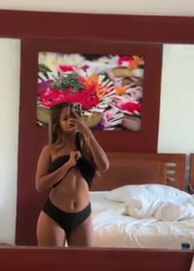 A woman with long brown hair stands in a hotel room and takes a selfie in a full-length mirror. She is wearing a black strapless top and black underwear. The bed behind her is unmade with white sheets and a pillow. There is a large framed picture of flowers above the headboard of the bed. The woman is holding her phone up in front of her face to take the picture.