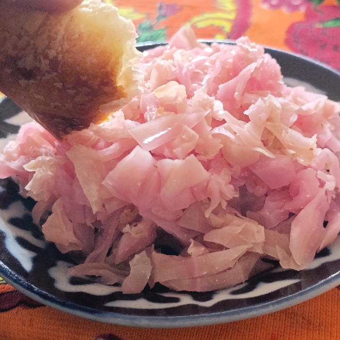 A close-up photograph depicts a human hand dipping a piece of bread into a mound of light pink, shredded food on a patterned plate, situated in an indeterminate indoor location within the city of Unknown, Unknown. The food, appearing translucent and irregular in shape, resembles pickled ginger or cabbage. It is contained within a ceramic plate featuring a dark rim and a blue and white patterned border. A light-skinned human hand, with visible thumb and index finger, grasps a torn piece of bread, characterized by a golden-brown crust and a light beige interior, which is partially submerged in the pink food. The plate rests on an orange surface adorned with an indistinct, multi-colored pattern, indicative of a tablecloth.
