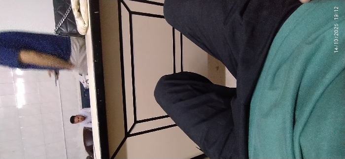 The image captures an indoor scene in Barza Municipality, Syria. The perspective is a low-angle view from a seated position, looking over the photographer's legs. In the immediate foreground, the photographer's legs are visible, clad in dark trousers over a teal-colored undershirt or garment. A light-colored table surface with a dark, likely metal, support frame occupies the mid-foreground. Behind this table, a person is captured in motion blur, standing or moving, wearing a dark blue short-sleeved shirt and light-colored trousers. This individual holds a dark rectangular object, consistent with a mobile phone, in their right hand. To the right, on the same table surface, a black quilted shoulder bag with a metallic chain strap rests alongside a folded, light-colored fabric item. In the background, a male individual with short dark hair is seated at a second table, facing forward, wearing a light-colored collared shirt. His forearms rest on the tabletop. Dark chairs are partially visible behind him. The background walls are light-toned, possibly tiled or paneled, with horizontal lines and a bright overhead light source reflected near the ceiling. The setting appears to be a functional indoor space such as an office or waiting area. A digital timestamp "14/10/2025 19:12" is present in the lower right corner.