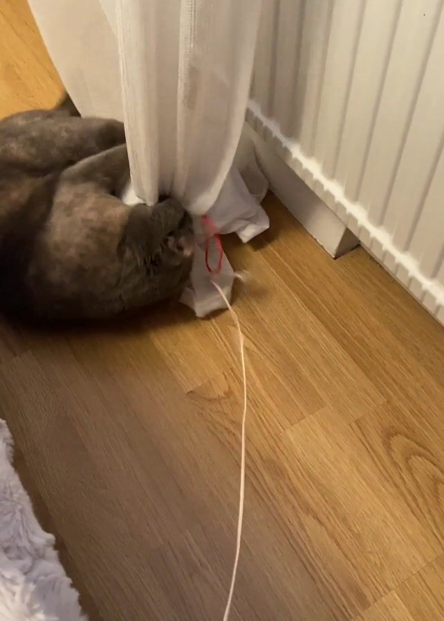 tortoiseshell cat lying on a wooden floor, playing with a toy mouse attached to a string. The cat is lying next to a radiator and a white curtain. The cat is batting at the mouse with its paws.