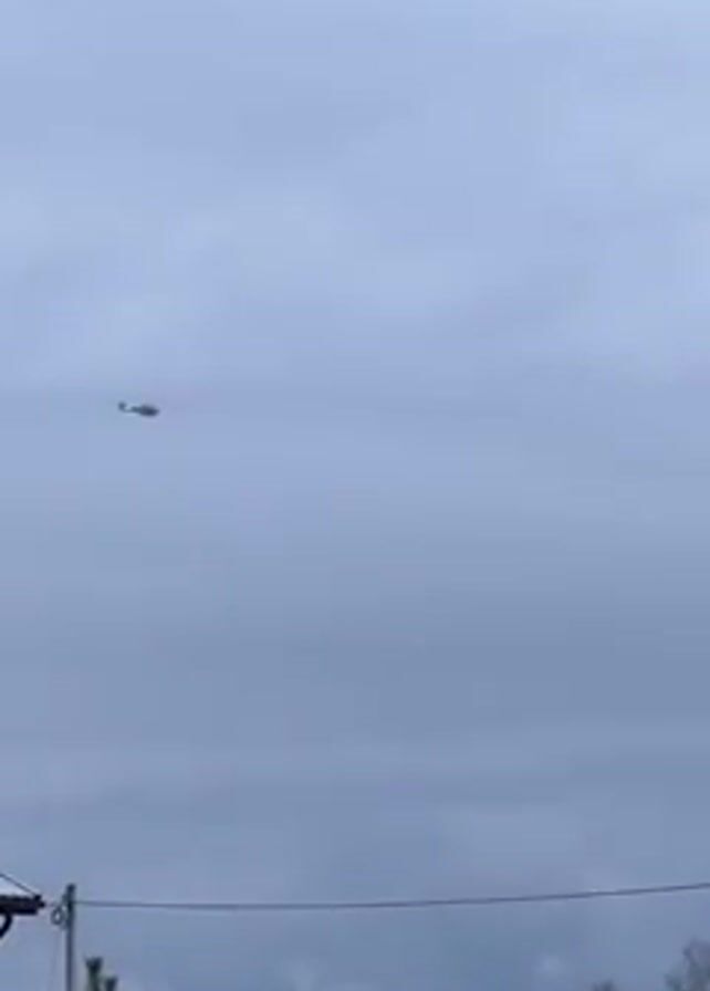 helicopter flying in the sky on an overcast day. The scene is from a residential area with snow on the ground. A building, trees, and power lines are visible in the foreground. The helicopter appears small in the distance against a gray cloudy sky.
