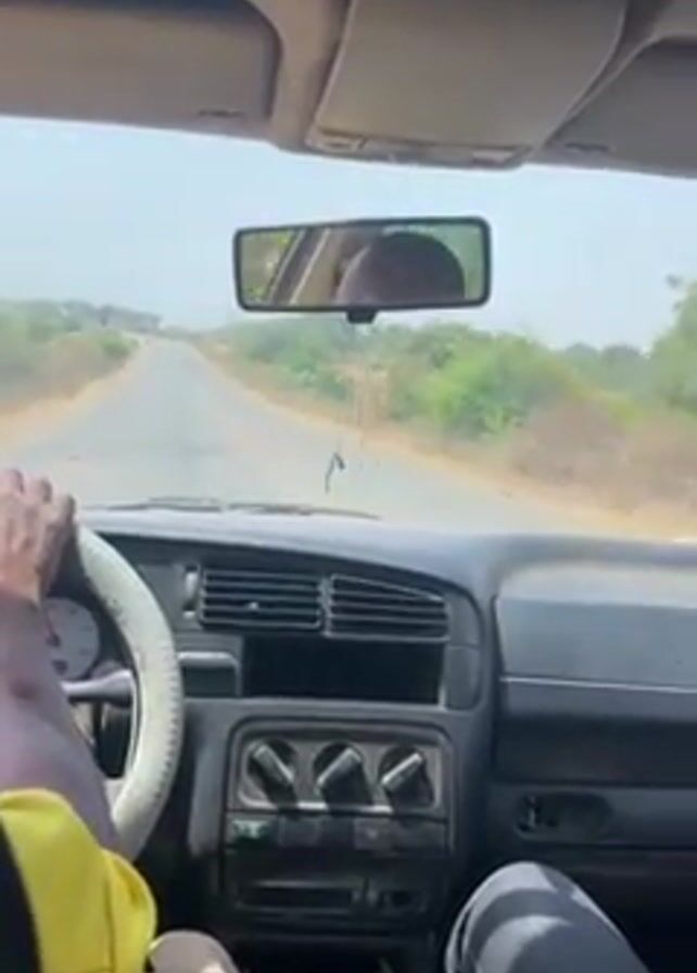 view from inside a car driving on a paved road. The driver, visible in the rearview mirror and by their hands on the steering wheel, is wearing a yellow shirt. A passenger in black jeans is visible in the lower right corner of the frame. The car's dashboard and interior are old and worn, with visible air vents and simple controls. Outside, the landscape is dry and scrubby, with sparse trees and vegetation under a bright, clear sky. The road stretches straight ahead, disappearing into the distance.