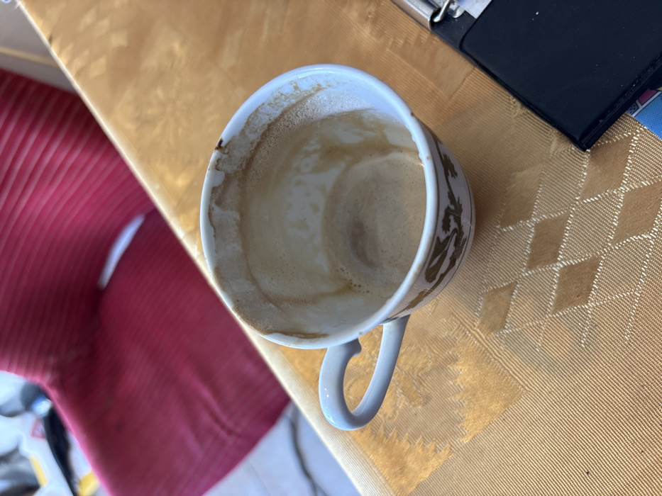 - "The image depicts a close-up view of an empty white ceramic cup, positioned on a golden-yellow woven tablecloth or placemat, within the city of Stefan Karadja, Bulgaria" by FM-kr1G73, licensed under CC BY 4.0