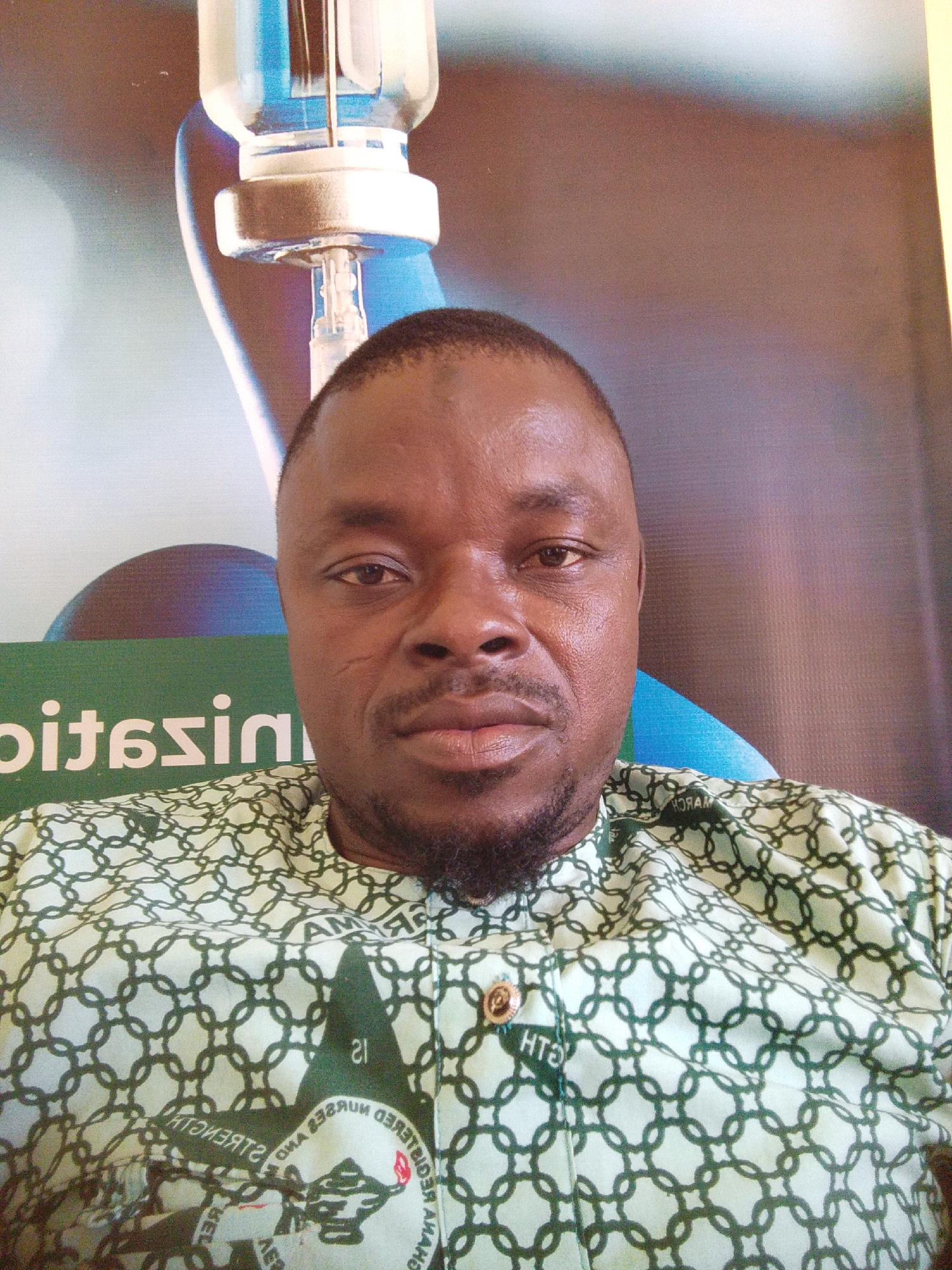 An adult male with dark skin, short dark hair, and a trimmed full beard and mustache is depicted in a chest-up portrait. He wears a light-colored shirt patterned with dark green, interlocking chain links. A dark green star emblem is visible on the left chest area, displaying reversed white text that includes "REGISTERED NURSE AND" and "STRENGTH." Additional reversed text, "MARCH," is present near the right collar. The background features a large, glossy display or poster with a medical theme. In the upper right, a clear glass vial with a metallic cap and an inserted needle is visible. A lower left section of the background shows a green area with reversed white text, partially decipherable as "nization." The scene is located in Dungu, Ghana.