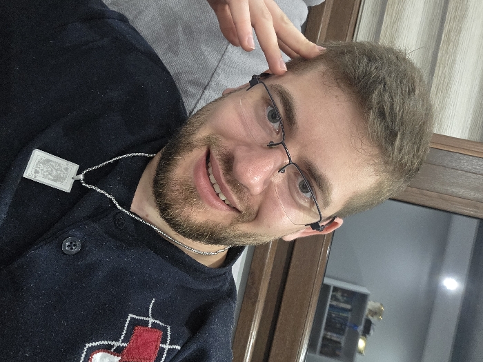 The image presents a headshot of an adult male in an indoor setting, located in Yagodovo, Bulgaria. The subject has light brown, short hair, a light stubble beard, and is wearing dark-rimmed, half-frame eyeglasses. His expression is a smile, and his right hand is resting with fingers near his right temporal area. He is dressed in a dark blue long-sleeved shirt featuring a red and white patterned emblem on the left chest. A silver-colored rope chain necklace with a rectangular silver-colored pendant, depicting an engraved playing card (King of Spades), is visible around his neck. The background to the left shows a grey upholstered surface and a window with light-colored horizontal blinds behind a dark wooden frame. To the right, a dark wooden frame is present. A reflection in a glass surface reveals an interior space with a light-colored wall, a circular ceiling light fixture, and a white multi-shelf unit containing objects.